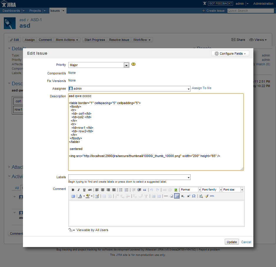 The following shows the field being edited with the "Some" tags stripped option. Note the table and img tags remain, but the others are removed.